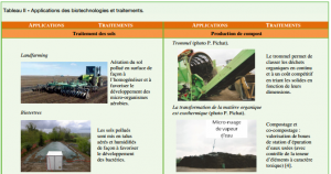 Le tableau II montre comment les biotechnologies contribuent à la gestion des déchets, subvenant ainsi aux besoins de la société pour le traitement des sols, la production de compost, les fertilisants et conditionneurs de sol, l’épuration des eaux, la production d’énergie.