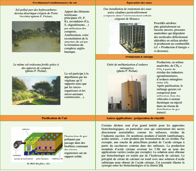 La mise en œuvre des micro-organismes par les biotechnologies contribue à subvenir aux besoins de la société en transformant les déchets ayant une teneur substantielle en matière organique et une teneur négligeable en éléments toxiques.