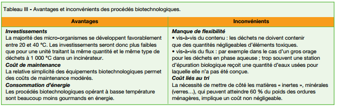 Les progrès importants que l’on peut escompter avec les biotechnologies permettent d’entrevoir une utilisation accrue de ces procédés pour le traitement des déchets, qui est effectué actuellement à haute température et à haute pression, nécessitant un apport important d’énergie (voir tableau III).